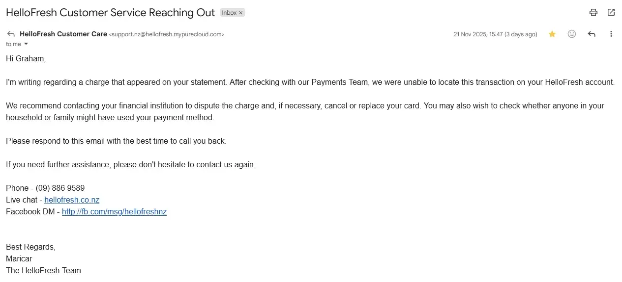 Still smelt a rat. Retained the mail... and sure enough noted a DEDUCTION in my Bank Account for an Order that DID NOT EXIST. And on a Cancelled Account. Called the Bank to bounce it, advised to get Hello Fresh to Release the funds back into my bank account immediately as that was theft. Spoke to someone at Hello Fresh from the deep jungles of Gujarat (or similar) and asked to "Prove" the deduction by screen shot. I did. Was told I would receive a call within 30 minutes to discuss and confirm rightful repayment... NOTHING. Left it overnight... Called again, someone from Bhagalpur (or similar) started to give me the standard script BS. Cut short, I'm on a damned Pension, every penny cent counts... $80.99 STOLEN from my account has a massive knock on effect and throws my rent payments. DO NOT USE this business IF you like your freedom, and prefer to retain your money in your bank account not theirs. The Battle rages! Made worse and more confusing as I was recently NOT even a Customer, so don't have a reference. Dodgy, dodgy, they should be headquartered on a Fairground... and with the Clowns 🤡.