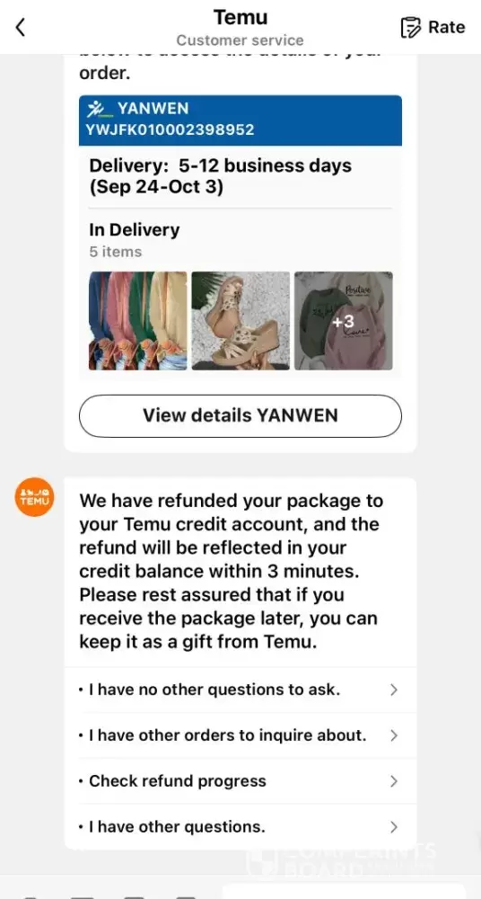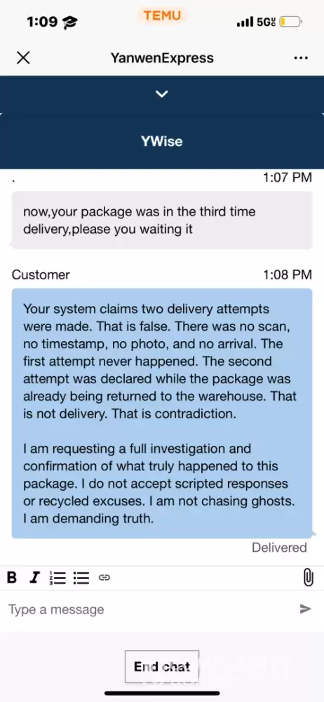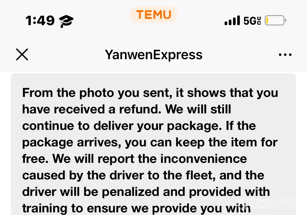 I have been reporting this issue to Temu and Yanwen Express from September 28 to October 22. The package was supposed to arrive between September 24 and October 3, but it got delayed.