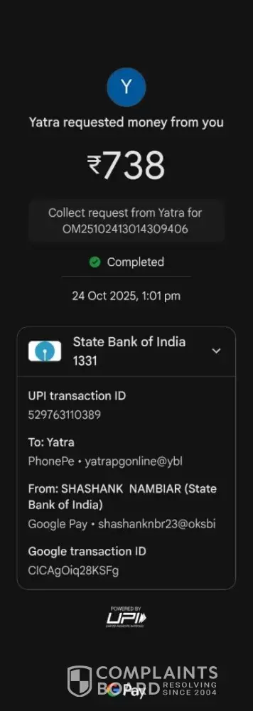 I had booked a hotel room at Signature Inn, majestic, Bengaluru on 24th Oct and made payment at 1.01pm via Gpay. the amount was debited from my account but has not reflected in the booking. I have been trying to connect with customer service of Yatra for the past few hours but all the toll free numbers seem to be redundant. I need the matter to be taken...