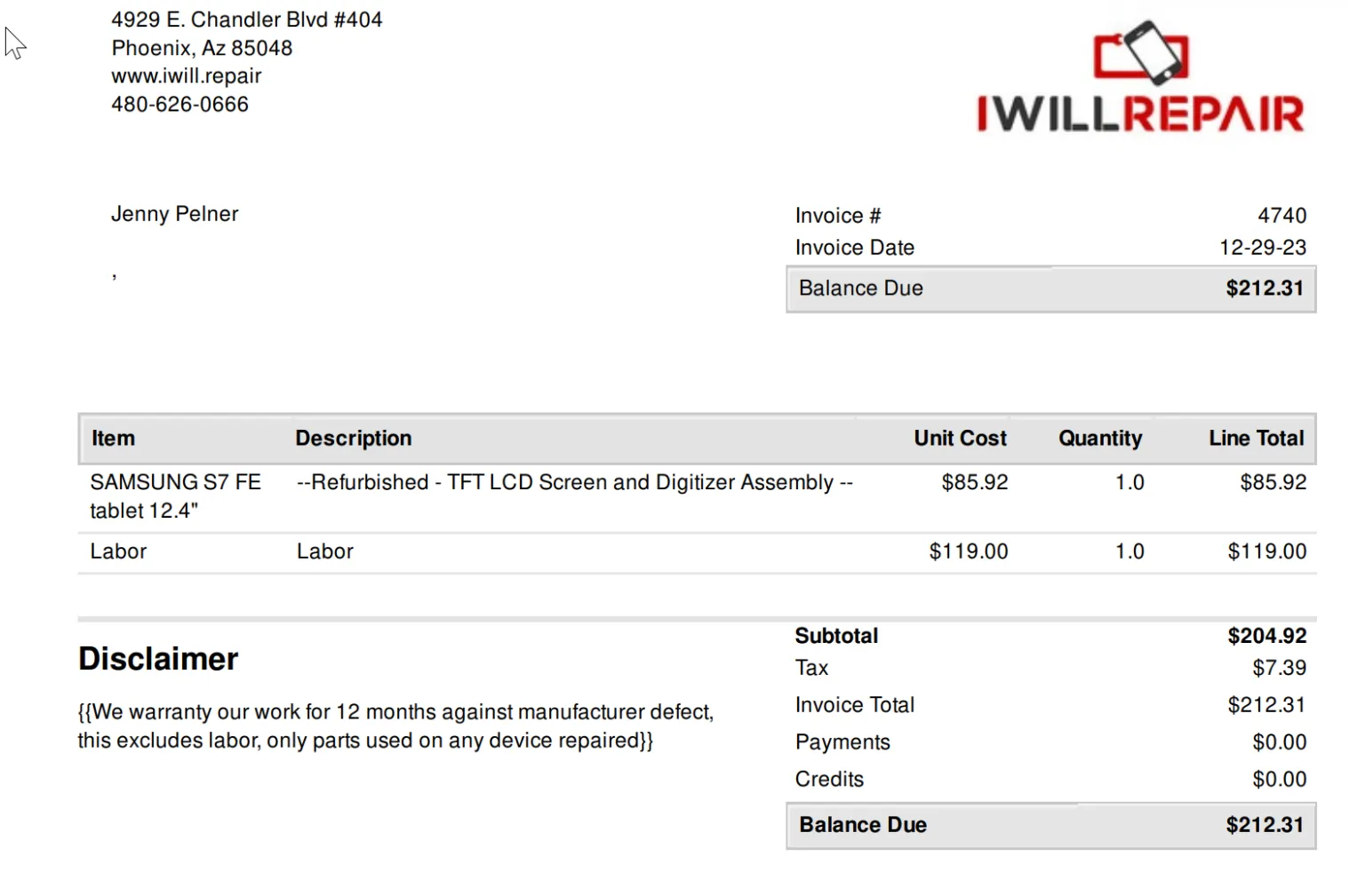 Claimed loss: My tablet screen replacement cost $212.31. I have the invoice and a picture of the broken screen.
