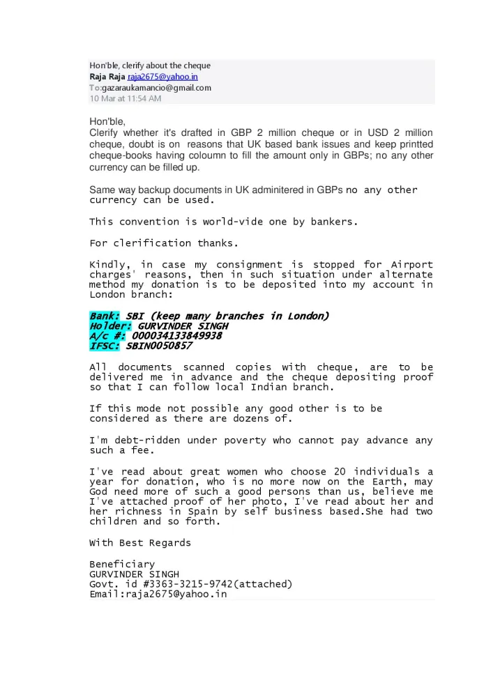 Billionare Amancio Oretega neither delivered nor deposited this two million pounds, GBP 2000000/- donation cheque in my SBI account.
