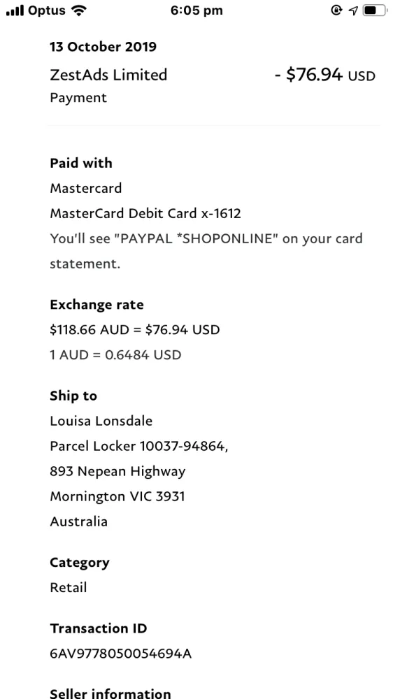 Ordered two of these virtually unbreakable phone charging leads and payment went through PayPal on 31st July 2019. It's now October and no goods delivered and the shipping/tracking information never came either. I want a full refund of the $26.76 immediately please and an explanation would be good too. I attach proof of the payment, the company. product and transaction number with dates below.